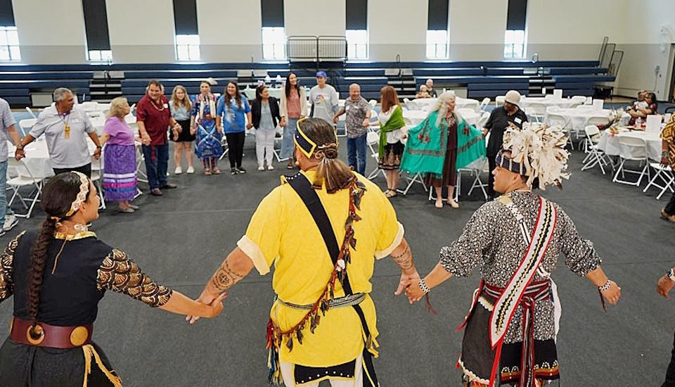 Dressed in regalia, Ryan Dial and his twin sister, Raven Dial-Stanley, led the dancing, which, he said, differed from ceremonial dances, which aren’t often done for the public.